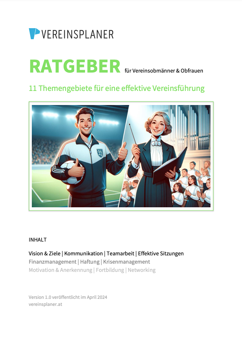 In diesem E-Book haben wir 11 wichtige Themen für die effektive Führung des Vereins zusammengefasst. Tauche ein in unser E-Book "Ratgeber für Vereinsobmänner & Obfrauen" und erhalte wertvolle Einblicke in die Welt der Vereinsführung.